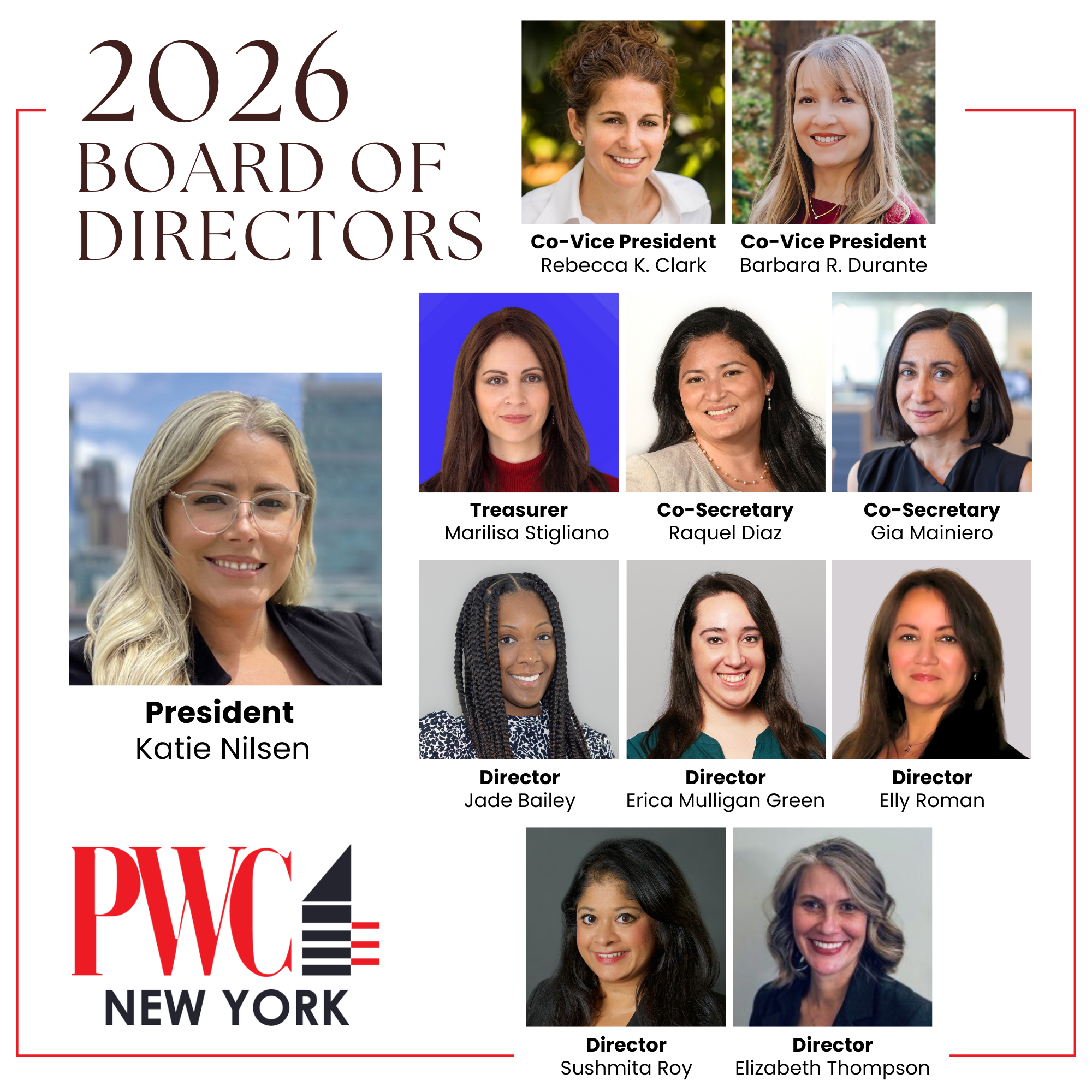 PWC NY is proud to introduce our newly appointed Board of Directors, led by incoming President Katie Nilsen
